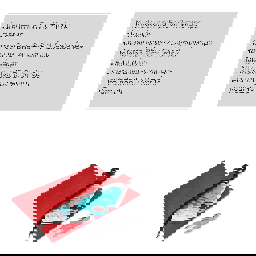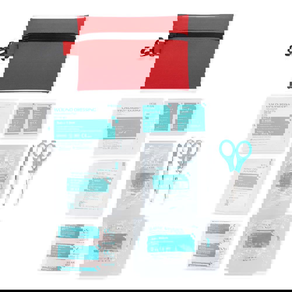 Deze EHBO set wordt geleverd in een handige 300D polyester etui met karabijnhaak en voldoet aan Europese normen. Ideaal voor reizen, outdoor-activiteiten of in de auto of rugzak voor kleine noodgevallen. Inhoud: 2 × non-adherente pads 5 × 7.5 cm, 1 × schaar, 1 × pack van 5 non-woven sponzen 2" × 2" 4-laags, 1 × medische tape 1.25 cm × 4.5 m, 2 × alcoholpads, 5 × pleisters 72 × 19 mm, 1 × elastisch crepeverband 5 × 450 cm, 1 × pincet.
