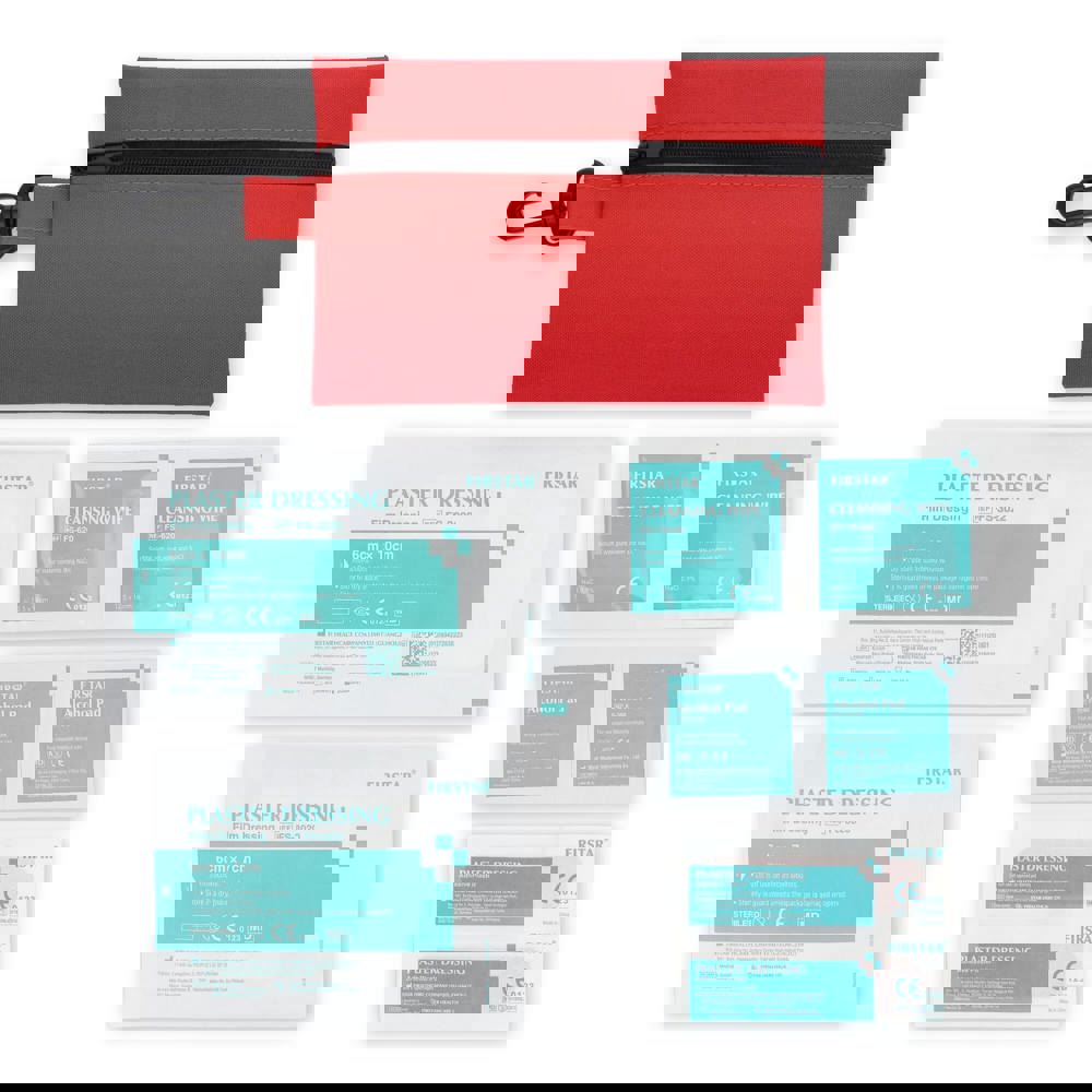 EHBO set in een 300D polyester etui met karabijnhaak. Voldoet aan de Europese normen. Ideaal voor buitengebruik, reizen of sportevenementen. Inhoud: 2 x 6 x 7 cm filmverbanden, 2 x 6 x 10 cm filmverbanden, 5 x pleisters, 2 x reinigingsdoekjes, 2 x alcoholdoekjes.