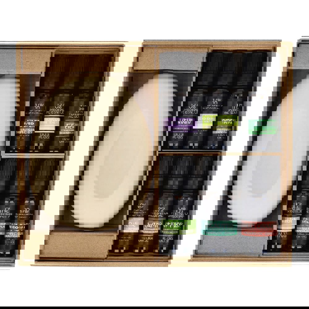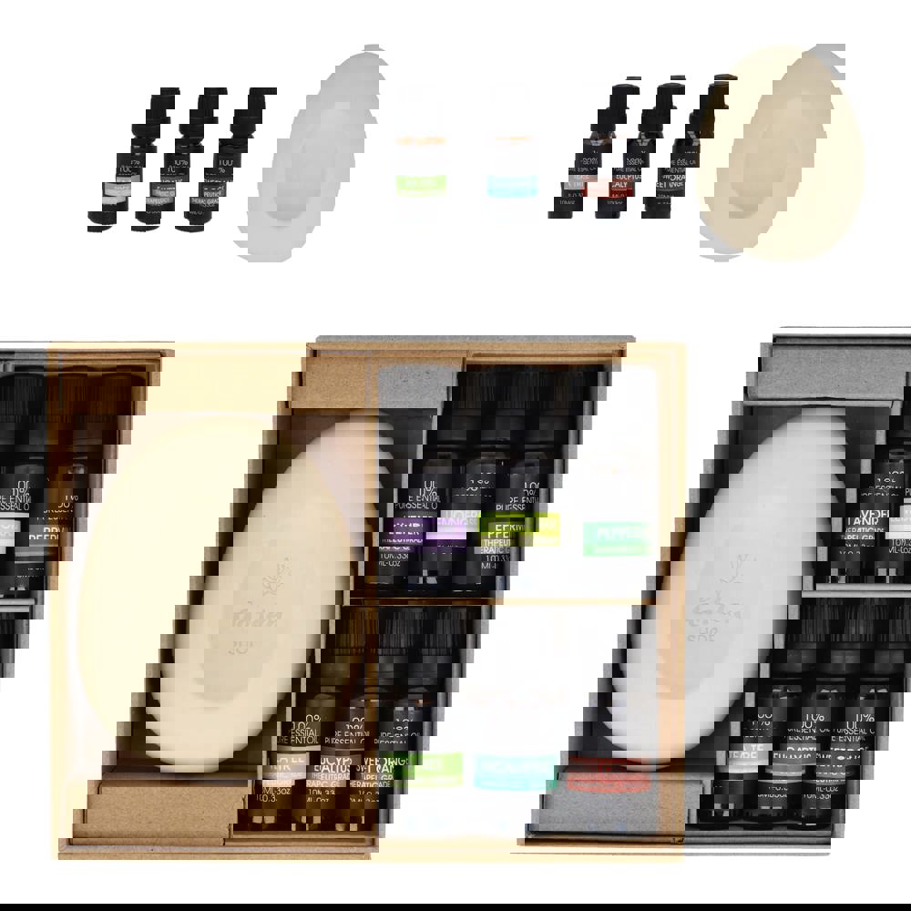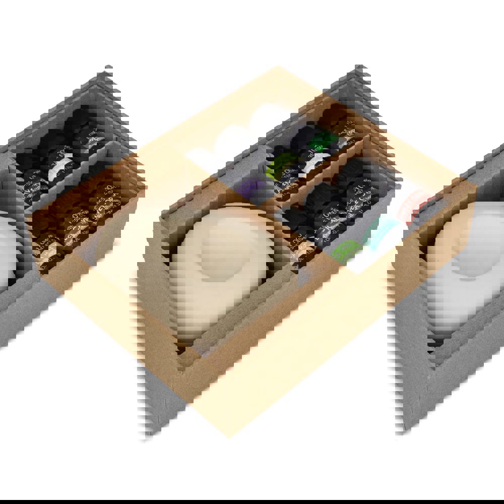 Transformeer je ruimte in een rustgevende oase met deze InSideOut Aroma Pebble Giftset met 6 Essential Oils. Deze set is voorzien van een prachtige ongeglazuurde keramische steen en heeft geen elektriciteit of warmte nodig. Dit maakt het een veilige en natuurlijke manier om te genieten van de rustgevende voordelen van aromatherapie. De set bevat zes hoogwaardige essentiële oliën (elk 10 ml), zodat u uw ervaring kunt personaliseren met een verscheidenheid aan geuren die ontspanning, focus of verkwikking bevorderen. Voeg gewoon een paar druppels van uw favoriete olie toe aan de steen en laat deze de geur absorberen en vrijgeven in uw huis, kantoor of werkruimte. Plaats hem in uw hal, woonkamer of kantoor. Kies de geur die het beste past bij uw stemming of de sfeer die u wilt creëren en geniet de hele dag van de rustige, verfrissende ambiance. De set is prachtig verpakt in een geschenkdoos en is een attent cadeau voor dierbaren en relaties. Lavender Peppermint - Sweet Orange - Eucalyptus - Sandel Wood - Lemongrass.