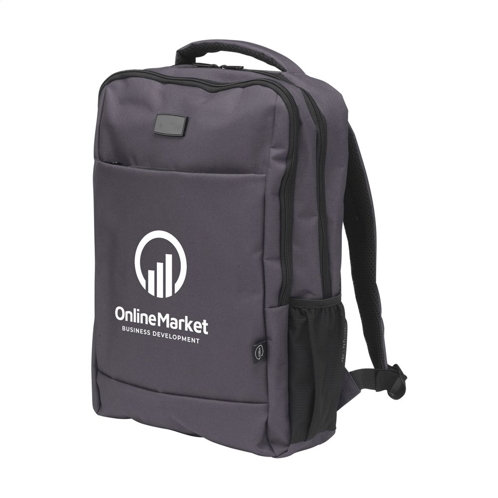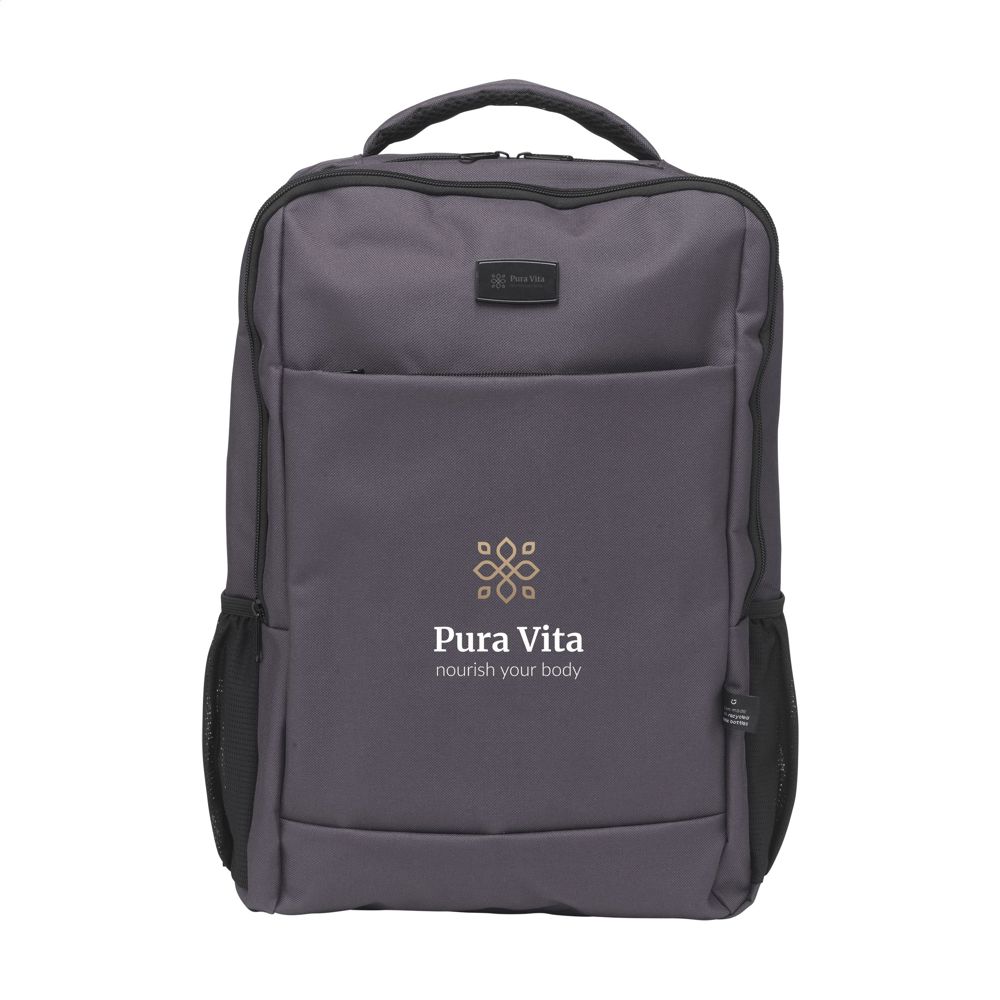 Solide rugzak van stevig RPET polyester. Met 2 royale compartimenten. Het eerste vak heeft veel ruimte en diverse insteekvakken voor het overzichtelijk opbergen van accessoires. Het tweede vak heeft een foam beschermvak voor het veilig vervoeren van een laptop tot 15,6 inch. Met extra ritsvak aan de voorzijde en een meshvak aan beide zijdes. De verstelbare schouderriemen, het achterpaneel en de handgreep zijn bekleed met mesh stof en voorzien van foam voor extra draagcomfort. Met extra lus om de rugzak aan een trolley te bevestigen, stevige ritsen, volledig gevoerd en keurig afgewerkt. Een luxe rugzak met vele extra's. GRS-gecertificeerd. Totaal gerecycled materiaal: 90%. Inhoud ca. 12 liter.