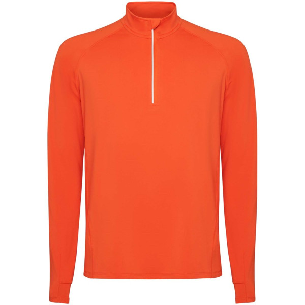 Technische raglan sweater met lange mouwen voor heren. Kraag met een halve rits en een omgekeerd ontwerp met reflecterende details. Verstevigde naden. Manchetten met duimopeningen. Reflecterende details op de achterkant. De zoom aan de achterkant is iets langer dan aan de voorkant. Warme geborstelde binnenstof.