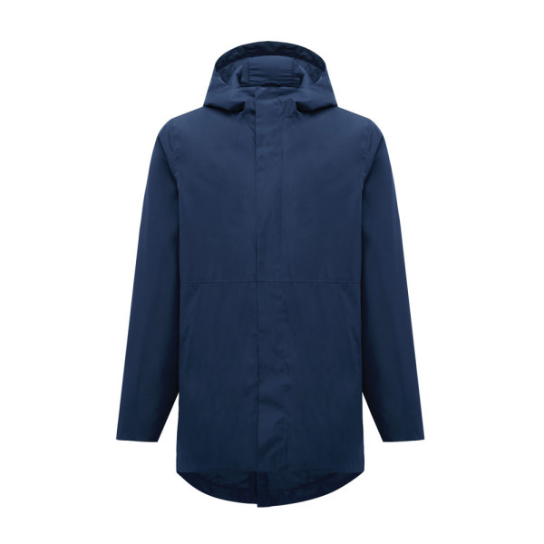 Unisex gewatteerde waterdichte parka van 100% gerecycled polyester. 4.000 mm waterdicht, ademend en windbestendig. Alle kenmerken van een klassieke parka: langere ruglengte, split achter, 2-weg rits, afgedekt door extra overslag met drukknopen, strakke mouwboorden met een extra binnenboord en capuchon met stoppers aan de binnenkant van de kraag. Gewatteerd met 100% r-polyester vulling en gevoerd met fijne taf. Aan de binnenkant onder zit een verborgen rits en links op de borst is plaats voor een decoratie. Het hele kledingstuk is gestikt met r-polyester naaigaren. Aan de achterkant van de nek zit een afscheurbaar maatlabel met een IQONIQ craft hangtag, aan de linker binnenkant van de zijnaad zit het waslabel. Het gebruik van echt gerecycled materiaal en de claims met betrekking tot de milieu-impact worden gegarandeerd door het gebruik van de AWARE™ disruptieve fysieke tracer en blockchain-technologie. Door de QR-code te scannen, krijgt u toegang tot een speciaal digitaal paspoort.
