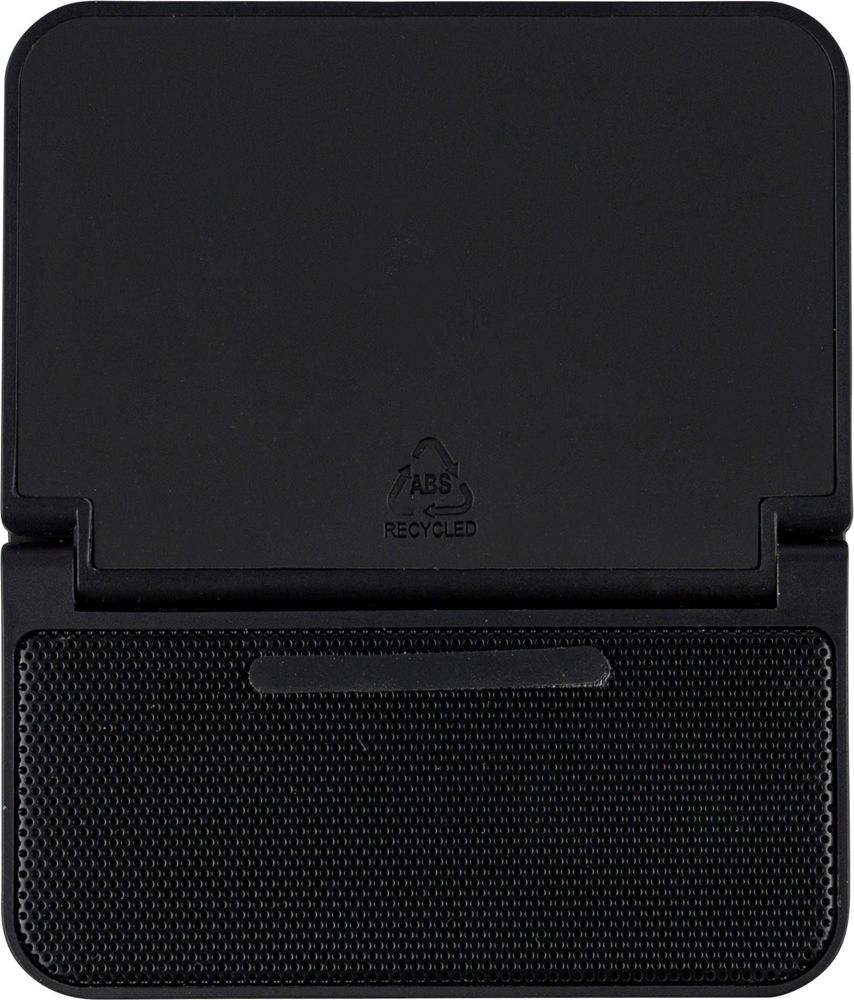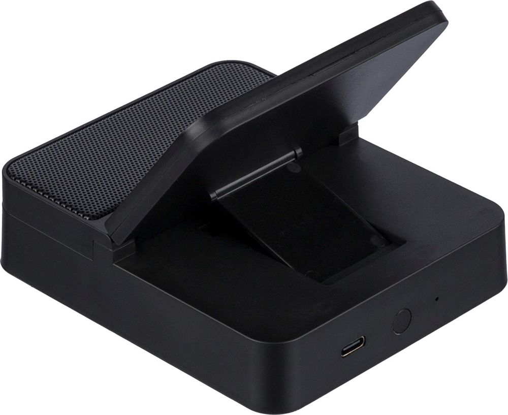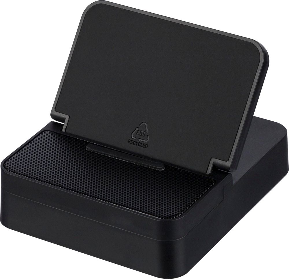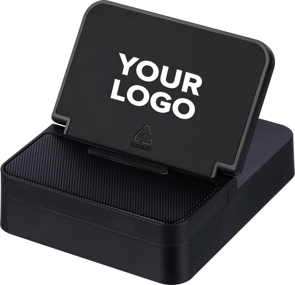 Gerecycleerd ABS 3-in-1 draadloze oplader, luidspreker en telefoonhouder in een kubusvormig...meer