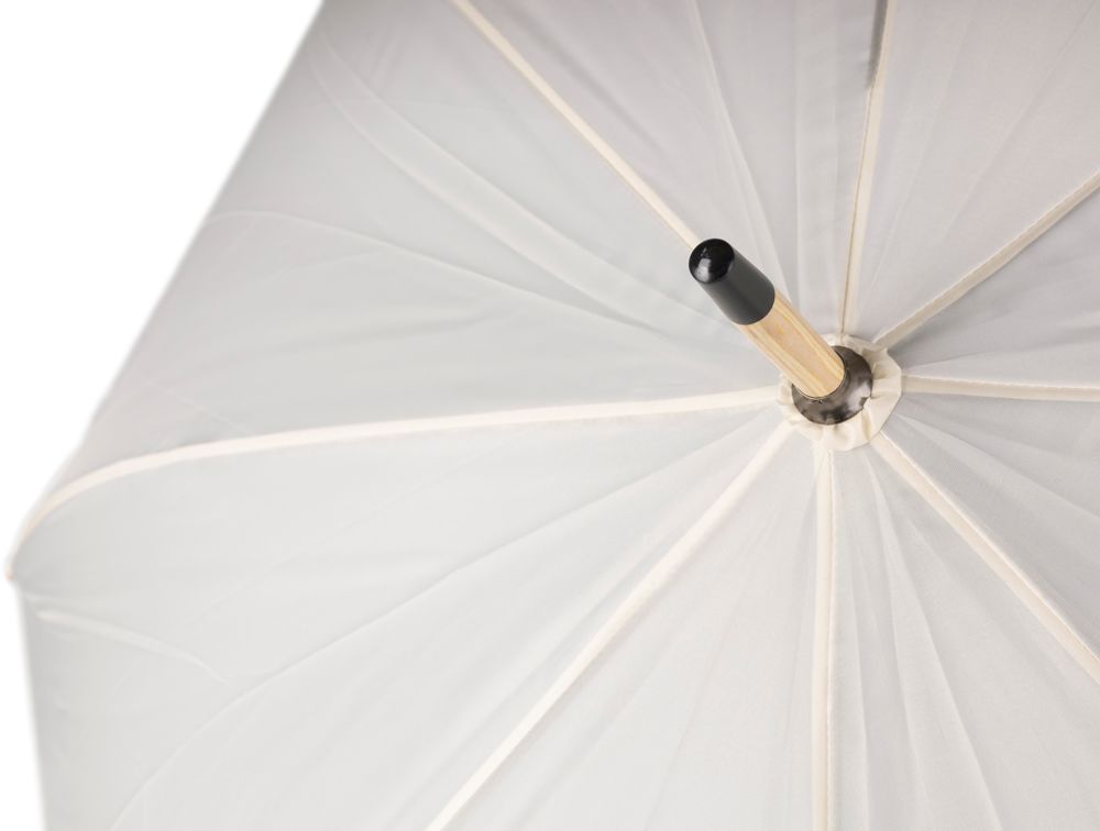 Automatische golfparaplu met 8 panelen, bamboe handvat, stalen steel met metalen frame en klittenbandsluiting. Inclusief rPET-label.