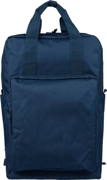 Rugzak van gerecycled 900D polyester met 210D voering en rPET-label aan de zijkant. Voorzien van een groot hoofdvak met ritssluiting en 16-inch laptopvak, kleiner voorvak met ritssluiting, twee zijvakken en een trolleyband. Inclusief handgrepen met drukknoopsluiting en verstelbare, geventileerde schouderbanden.