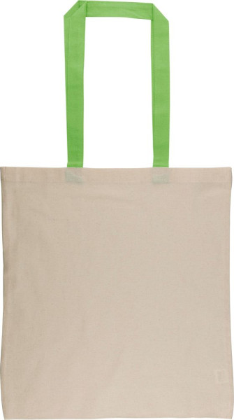 Katoen (14 g/m²) boodschappentas in natuurlijke kleur met gekleurde hengsels. Afmeting 38 × 42 cm...meer