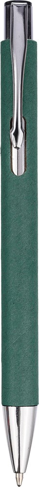 Gerecycled karton balpen met chromen accenten. Punt en drukknop zijn van plastic, en de clip van metaal, blauwe inkt.