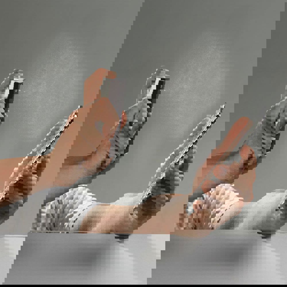 Rechthoekig blokje met schoonmaakspray en microfiber doekje in één voor het reinigen van allerlei beeldschermen.