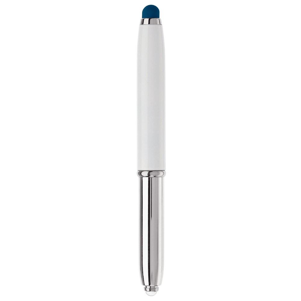 Touchscreen pen met lampje en balpen. Balpen te gebruiken door dop eraf te halen. Blauwschrijvend.