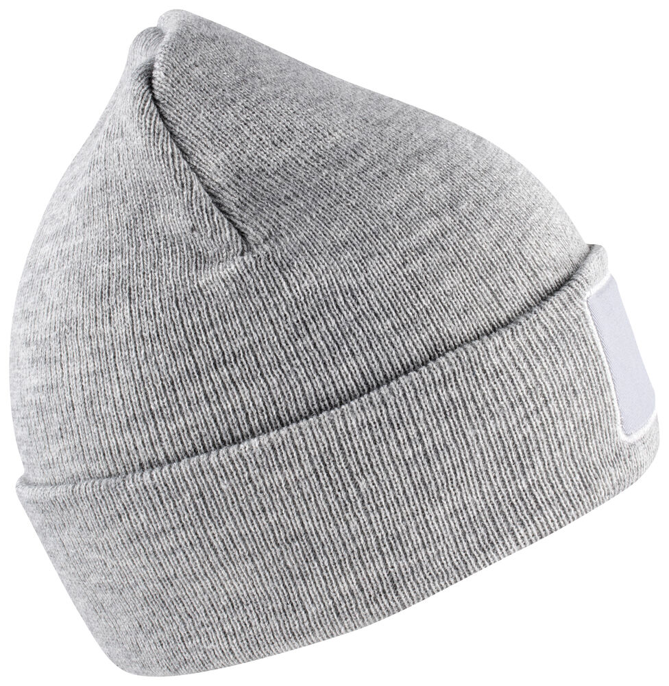 Klassieke, gebreide muts met een patch (9,5 x 4,5 cm) aan de voorzijde voor het gemakkelijk veredelen. De muts is voorzien van een omgevouwen rand voor een optimaal draagcomfort.