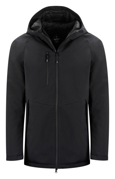 Middellange winterjas. Buitenstof gebonden met fleece aan de binnenkant. Two-way waterdichte ritssluiting vooraan en aan de borstzak.