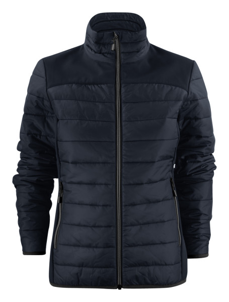 Lichte jas in twee materialen: juk en zijpanelen in softshell en body (voor-en achterzijde) en mouwen in lichtgewatteerd taffeta materiaal. Contrasterende ritssluiting. De zippullers kunnen indien gewenst vervangen worden door één van de andere beschikbare kleuren.