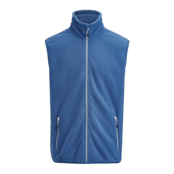 Geborstelde bodywarmer met lange ritssluiting voor dames en heren. Geborsteld aan beide zijden. Twee voorzakken, contrasterende ritssluitingen en decoratieve stiksels. Elastische tape aan de boord onderaan.